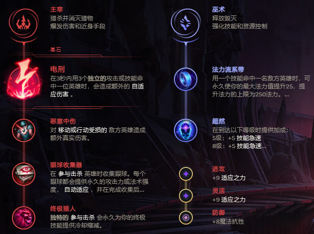 丽桑卓属于连招型的英雄,点电刑配合 EWQA 一套可以触发电刑打出一套爆发,所以基石点电刑对于丽桑卓这种连招型、打爆发的英雄来说是非常实用的。丽桑卓的技能基本都有限制移动的能力(Q 减速 W 禁锢 R 控制),所以点恶意中伤可以增加额外真实伤害,适应程度非常高。眼球收集器主要是增加伤害叠加,属于发育型的符文点。底层符文点终极猎人,可以降低丽桑卓 R 技能的 CD,这样可以让丽桑卓的大招更快的转过 CD。