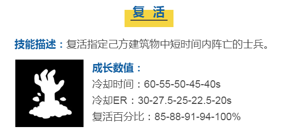 该技能最好在受到大规模攻击后使用,能够复活从收到攻击开始至使用技能时,这一时间段内死亡的一定数量的士兵,因此掌握好使用的时机非常重要。