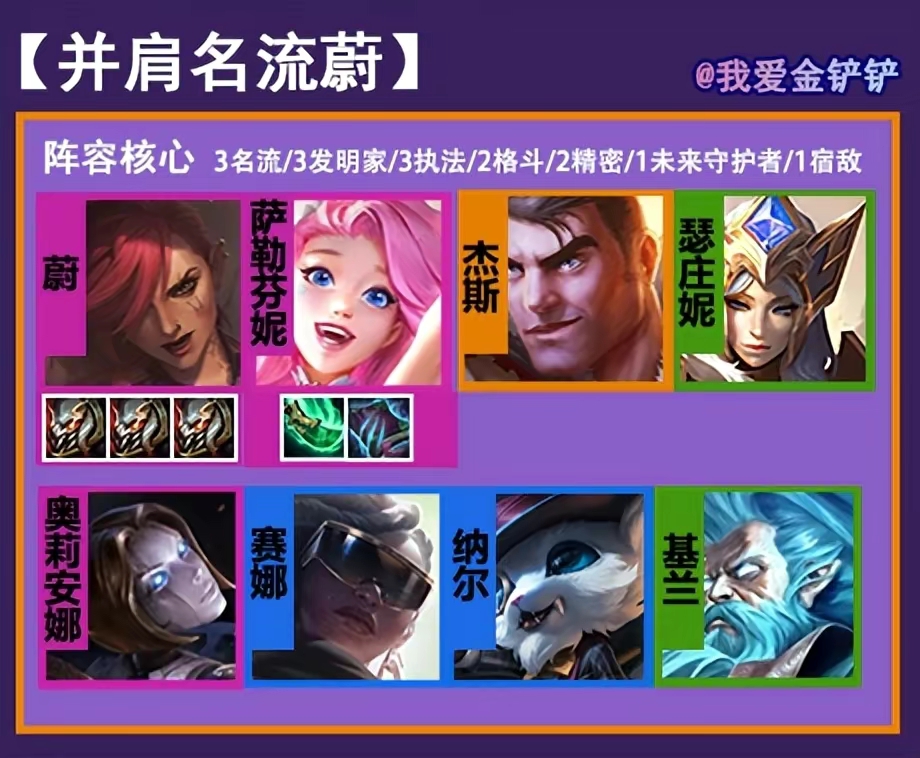 有【发明家转职】或者【精密发条转职】,可以下掉一个名流,上【5 发明家】或者【4 精密】。没有【3 名流】,“蔚”的第三件装备放“正义之拳”。