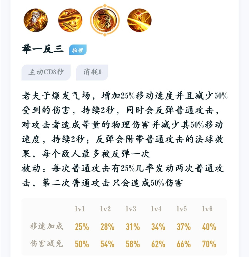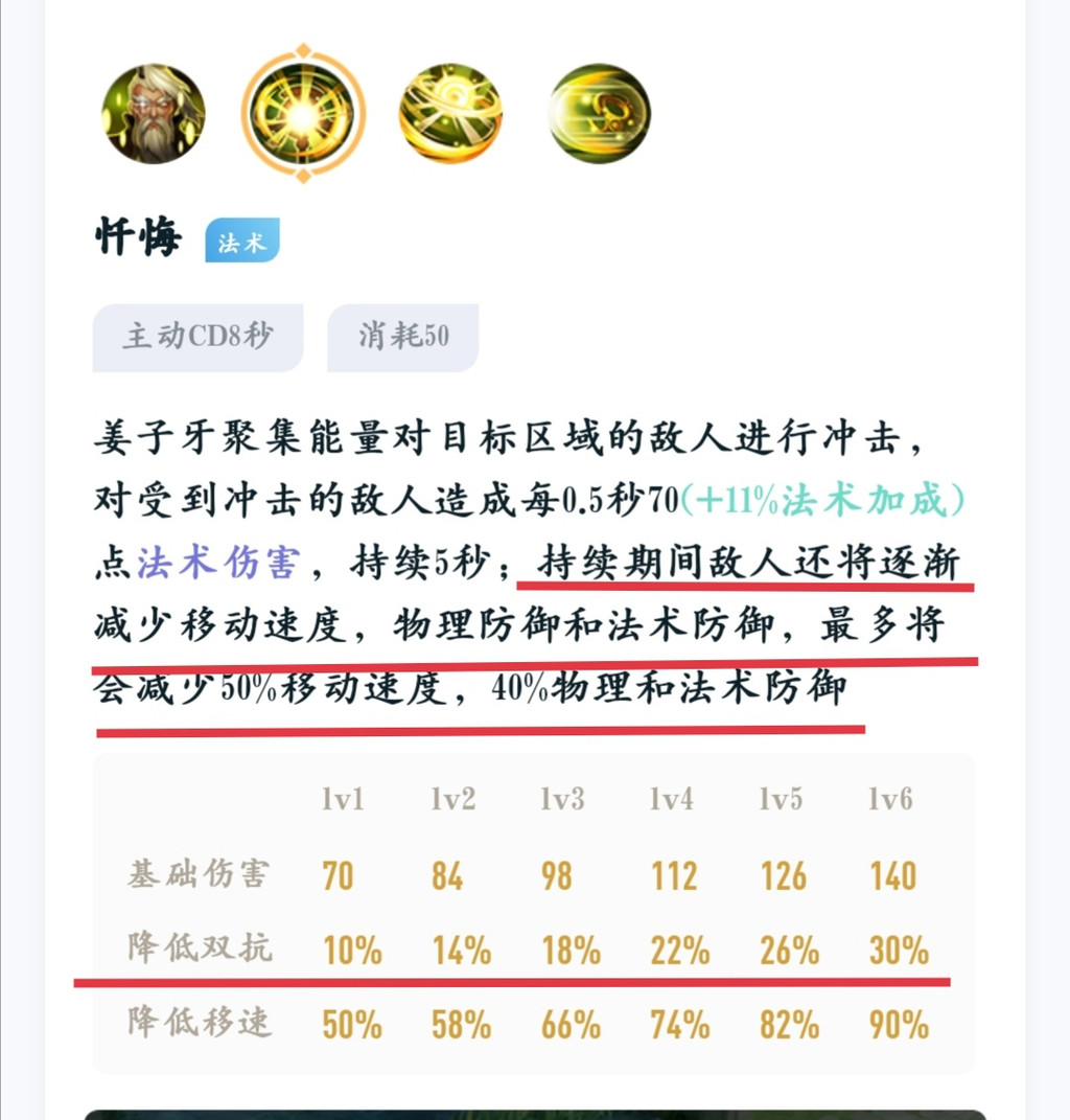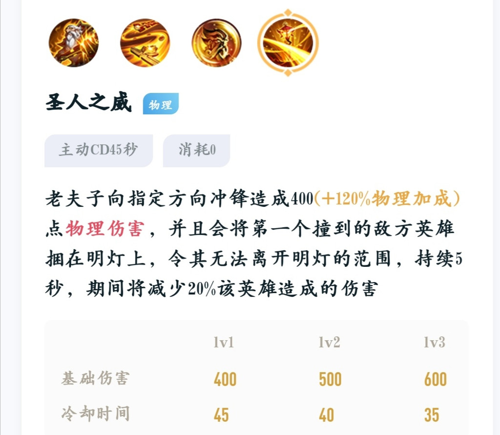 他的一技能有个特殊的机制:减双抗。这里我们能看出,姜子牙随等级的提升技能减少的双抗就会增加,而且还有一个持续伤害。 接下来是老夫子