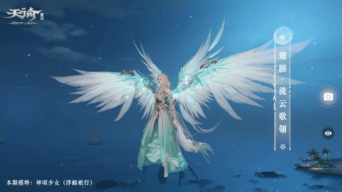 在天空自由翱翔,一直是许多冒险家最爱做的事情。那么在这春光明媚的季节,这款自带仙气与清新的新翅膀“流云歌翎”一定是你云海翱翔的不二之选。圣洁的纯白加上那一点中心耀眼的蓝绿光芒,再配上全新时装“天海”,你不正是降临人间的春日仙子吗?