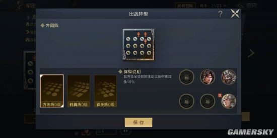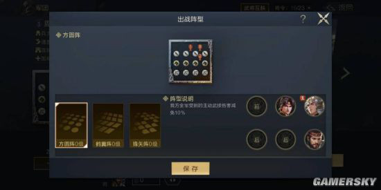 阵法阵法分为三种,方圆阵:受到的主动伤害降低 10%; 鹤翼阵:受到的连击伤害降低 10%; 锋矢阵:前 30 秒对敌伤害增加 5%(主公府达到九级后,可以改造阵法,进一步提升效果)。
