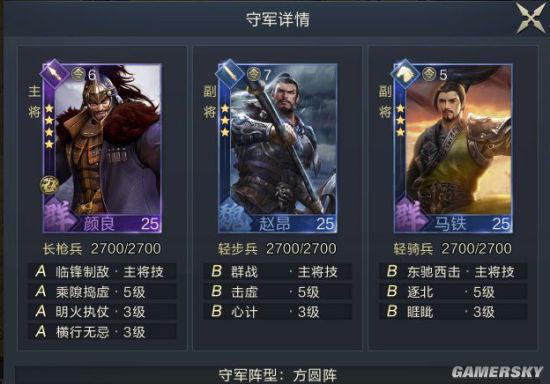 打五级地时,技能等级在五级左右,智力队伍有两个智力技能一个功能技能或者三个智力技能;武力队伍有三个武力技能,综合队有一智力一武力一功能(无定型要求,毕竟能抽到什么,看脸)。可以看到五级地块的守军品质为一紫两蓝,细心一点就能发现,守军的品质是不断升级的,携带的技能等级也越来越高。血量也提升到了 2700。开五级地有两种方式,强制开地法和水到渠成法