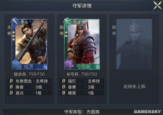 两近战一远战阵容按图示搭配,近战在前,远战在后;由于游戏本身机制是优先攻击站在自己面前的目标,所以在同一时间会有两个武将同时攻击敌方主将,使得我们对敌方主将的攻击更加凌厉。与此同时,我们第一排居中的主公也将被两人攻击,但是不要忘了,我们的主公的防御和智力成长值可是很不错的,加上被动技能附带前 30 秒增加 50 防御,以一抗二,不正好物尽其用。三近战阵容按图示搭配,物理武将在前,智力武将在后;物理武将一般拥有着比智力武将更高的护甲,更关键的在于智力武将一般不依赖普攻伤害,放在后排,更有利于存活和输出。同样是依赖相向站位优先攻击,达到爆头效果。