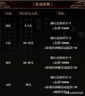 这次预热活动奖励倒是很多,分为 5 个阶级奖励,最低也能得到一片黑蛋碎加 1w 金币,最高能得到 5 片黑蛋碎,5w 金币,1 张现世符咒,还有用处未知的神秘活动道具 30 个,应该不是蛇皮吧?