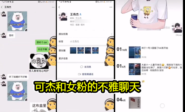 有网友在知名王者荣耀论坛爆料称,可杰的存在非常不妥的行为,可杰和前女友在 9 月 8 日分手,但是在此之前,可杰就和多位女粉丝有不恰当的关系,不仅双方在微信聊天时言语暧昧,还有许多令人难以接受的行为。爆料人还放出了许多可杰微信聊天的图片,证明自己所言非虚,从聊天截图来看,可杰确实在 8 月份还和其他女粉丝有着拎不清的关系,脚踏多船基本实锤。