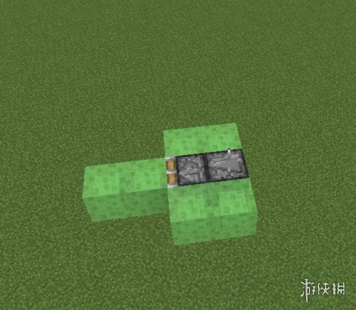 这两个粘液块的前方分别放两个粘性活塞,粘性活塞后面放两个侦测器。