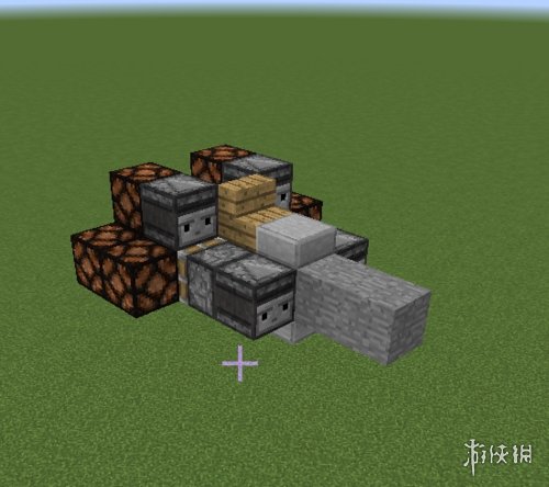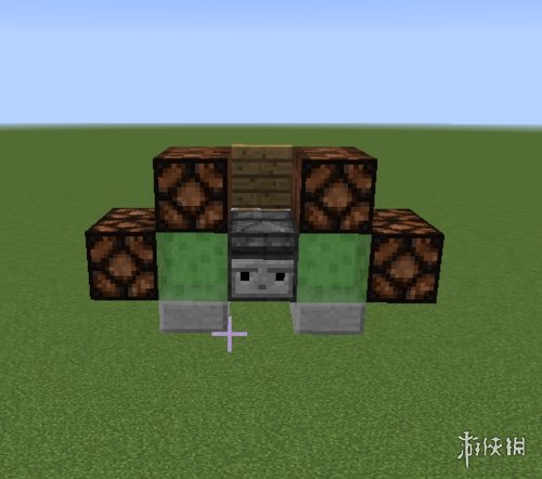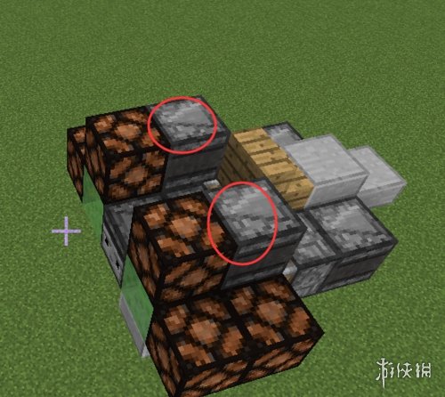 作为机头的粘液块前方放两个石头。楼梯前方的粘液块上方放一个半砖。