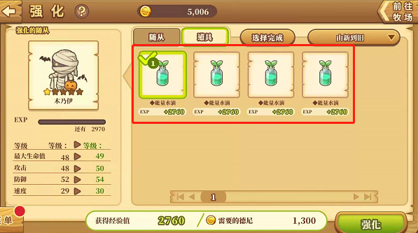 绵羊村一直流传着一个可怕的传说,如果你在漆黑的夜晚独自一人回家,会遇到一个手提南瓜灯笼、身边飞舞着蝙蝠的恐怖木乃伊,它会拦住你的去路并向你提出一个问题,如果你答对了,它会赠送给你一瓶能量水滴,消失不见,如果答错,它就会带走你的灵魂。据说侥幸答对的人,将能量水滴使用在随从身上,随从获得了强化,等级也提升了,非常的神奇。