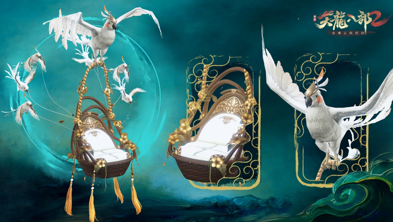 初春啄雀坐骑由七只白色鹦鹉与枝条编成的花篮组成,后方的六只鹦鹉嘴里衔着木枝宛如归巢一般,如此特色的坐骑一旦上街,定然会令少侠成为万众焦点!想象一下当少侠捏了一个猛男形象,却坐在被这七只小家伙吊着的花篮内。那景象定然十分喜感,瞬间就会成为街上最亮眼的人!