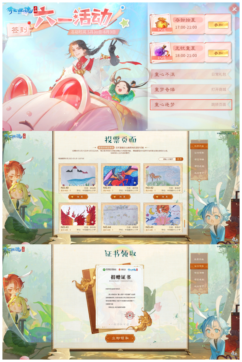 为进一步激发孩子们的创作力,倩女手游发起了围绕坐骑设计的绘画征集活动,截至征集结束,共收到来自 10 所学校近 500 份原创绘画作品。5 月 31 日-6 月 3 日,玩家可在游戏内六一活动界面点击【童心逐梦】,对心仪的作品进行投票。投票结束后,人气最高的绘画作品将作为 2024 年全服唯一坐骑的设计原型!参与过【共觅福缘】任务的小伙伴还可以在此专题页领取你的专属捐赠证书~快与倩女一起点亮心愿,为山区孩子们的梦想助力!