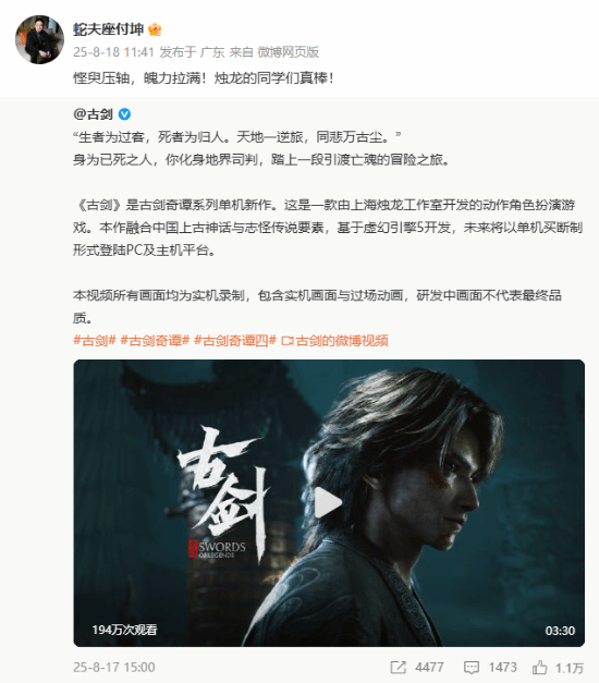 《湮灭之潮》的制作人付坤也转发了该消息,配文称“悭臾压轴,魄力拉满!烛龙的同学们真棒!”