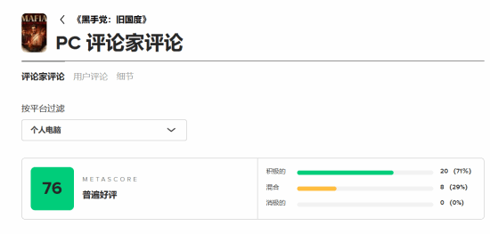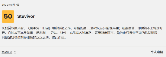 而 Stevivor 仅给出了 50 分的评价,认为《四海兄弟:故乡》从视觉效果来看堪称惊艳之作,但游戏玩法只能说平庸,谈不上是好玩。其游戏剧情本身就是一场悲剧——乏味、线性,充斥着各种套路,毫无新意可言。角色都是刻板的老套形象,仅此而已。